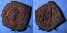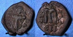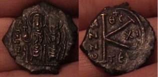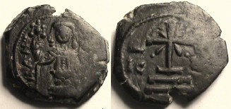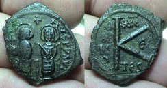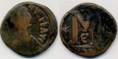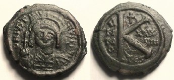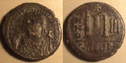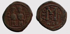 Obv: D N IVSTI NVS P P AVI, Justin, on left, holding globus cruciger, and Sophia, on right, holding cruciform scepter. .