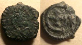 Obv: D N IVSTI NVS P P AVI, Justin, on left, holding globus cruciger, and Sophia, on right, holding scepter; cross above.