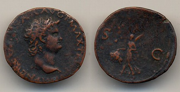 Nero CE Æ As 54 - 68 Obv: Bust right. Rx: TR POT COS IIII P P, Victory walking left, carrying shield inscribed S P/Q R. |