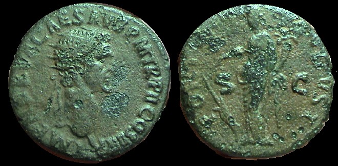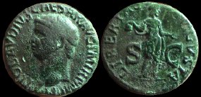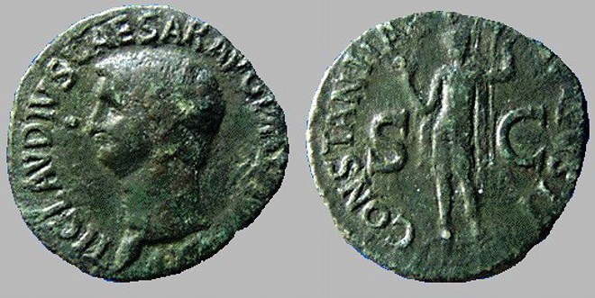 Claudius. 41-54 AD. Æ27 As Obv: TI CLAUDIUS CAESAR AVG P M TR P IMP, bare head left. Rx: CONSTANTIAE- AVGVSTI, S-C across field; Constantia standing left holding spear in left hand, raising right hand |