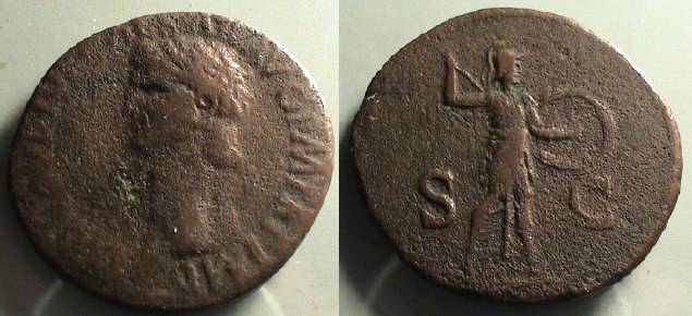 Claudius. 41-54 AD. Æ as (10.41 g) Obv: Bare head of Claudius right. Rx: Minerva advancing right, hurling javelin. |