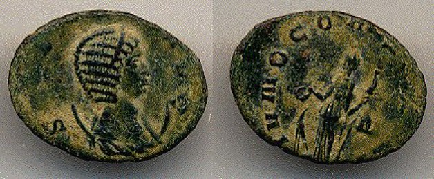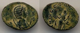 Salonia 253 - 268 CE Æ Antonin. Wife of Gallienus Obv: diademed & draped bust right resting on crescent. Rx: IVNO CONSERVATORI Juno standing left holding sceptre and patera. Notice how the letters in inscription seem to have disappeared-broken off. | reference - Sear 3040 |