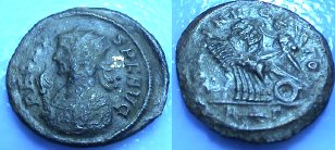 Rx: SOLI INVICTO, Sol in chariotracing left, R and gamma thunderbolt between in exergue .