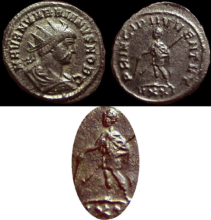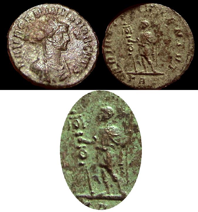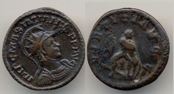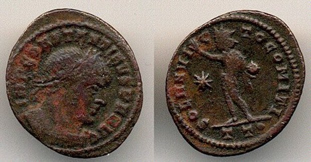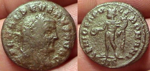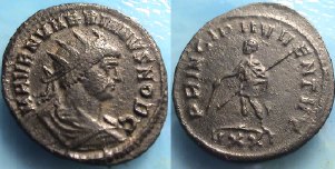 Rx: Emperor receiving Victory on globe from Jupiter; B in field, XXI in exergue.