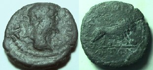Rev: Zeus enthroned pouring libation from patera, in left hand staff.